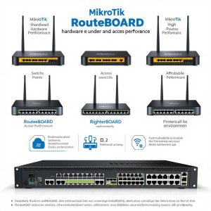 شرکت MikroTik علاوه بر سیستم عامل، سختافزارهایی تحت برند RouterBOARD تولید میکند که به عنوان روتر، سوئیچ و اکسس پوینت در شبکه استفاده میشوند. این سختافزارها به دلیل قیمت مناسب و عملکرد بالا بسیار محبوب هستند.
