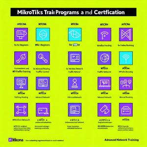 شرکت MikroTik دورههای آموزشی متنوعی ارائه میدهد که با گذراندن آنها میتوانید در زمینه استفاده و مدیریت تجهیزات میکروتیک مهارت کسب کنید. برخی از دورههای محبوب عبارتند از: